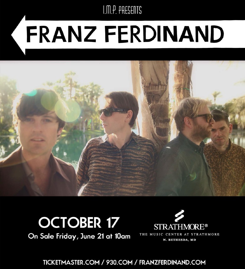 Franz Ferdinand is coming to Strathmore in Bethesda on Thursday, 17 October, and ShowlistDC is giving away a pair of tickets– before they go on sale to the public! All you have to do to enter is leave a comment on this post telling me which Franz Ferdinand song you’d most like to hear, and I’ll pick the winner at random (using random.org) on Thursday, 20 June at midnight Eastern. Be sure to use a valid email address when you enter, so I can contact you if you win (and don’t worry: your email address won’t be posted publicly when you comment on this entry and won’t be added to any sort of mailing list). If you’re a hotmail user, please add showlistdc@gmail.com to your address book or no-spam list, as other hotmail users have had problems with emails from us not getting through. Also note that we ask winners to respond within 24 hours, or else we have to pick another winner, so make sure to check your email regularly! Tickets go on sale on Friday, 21 June at 10 AM, so we’ll be sure to let the winner know before then!